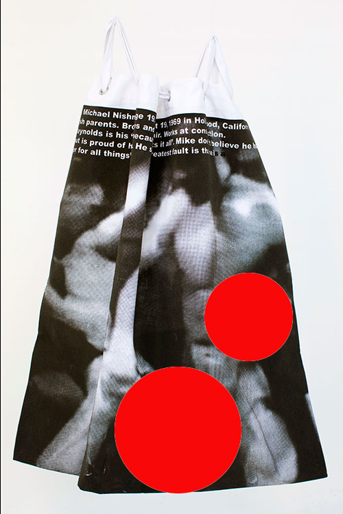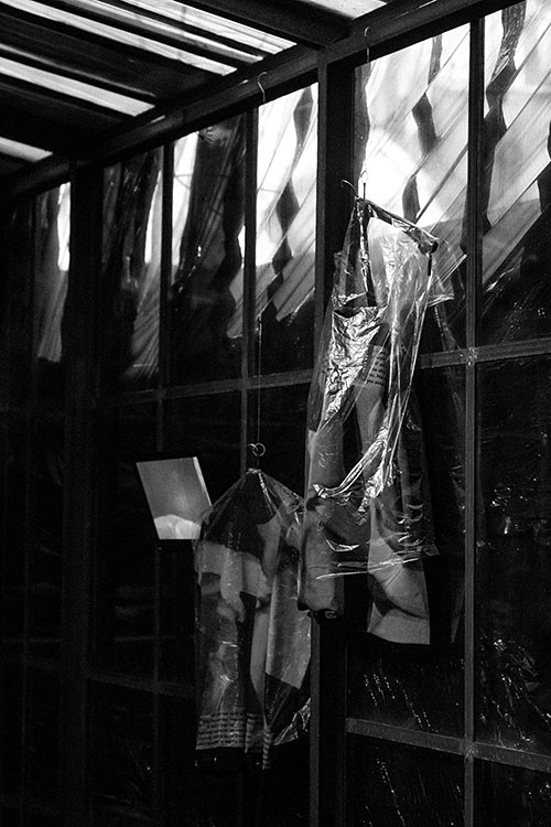 The Darkroom Series is a collection of clothing items with reproductions of explicit content from pornographic films. The first Darkroom Series was presented in 2006. This one from 2016 includes four new products. For this occasion, the E.A. 1/1 S.V. studio was wrapped in five kilometers of black stretch foil, and its interior was used to exhibit a series of clothing items and to present our 1/1 Magazine. Three television sets showing excerpts from a pornographic film were also installed in space.
